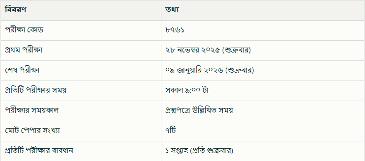 এই পরীক্ষা মোট ৭টি পেপারে অনুষ্ঠিত হবে এবং সবগুলো পরীক্ষা শুক্রবার অনুষ্ঠিত হওয়ার কারণে শিক্ষার্থীরা প্রতিটি পরীক্ষার মাঝে ১ সপ্তাহ করে সময় পাবেন প্রস্তুতি নেওয়ার জন্য। এই পোস্টে আমরা সম্পূর্ণ রুটিন, প্রবেশপত্র সংগ্রহের নিয়ম, কেন্দ্র ফি এবং পরীক্ষার প্রস্তুতির টিপস নিয়ে বিস্তারিত আলোচনা করব।