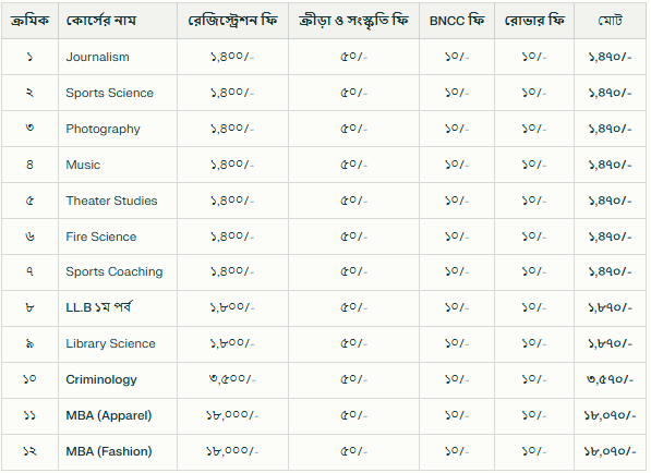উপরের ফি শুধুমাত্র জাতীয় বিশ্ববিদ্যালয়ের অংশ। কলেজ কর্তৃক নির্ধারিত কলেজ ফি আলাদাভাবে জমা দিতে হবে।